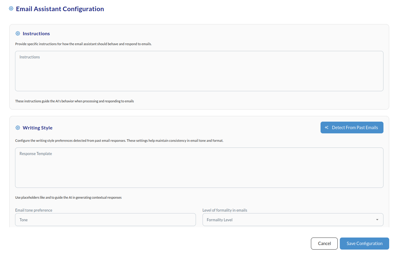Customize how the assistant writes emails to match your team’s communication style. Use the “Detect from Past Emails” button to auto-detect your writing style from your past sent emails and pre-fill the settings.- Writing style: Adjust tone, formality, and language preferences