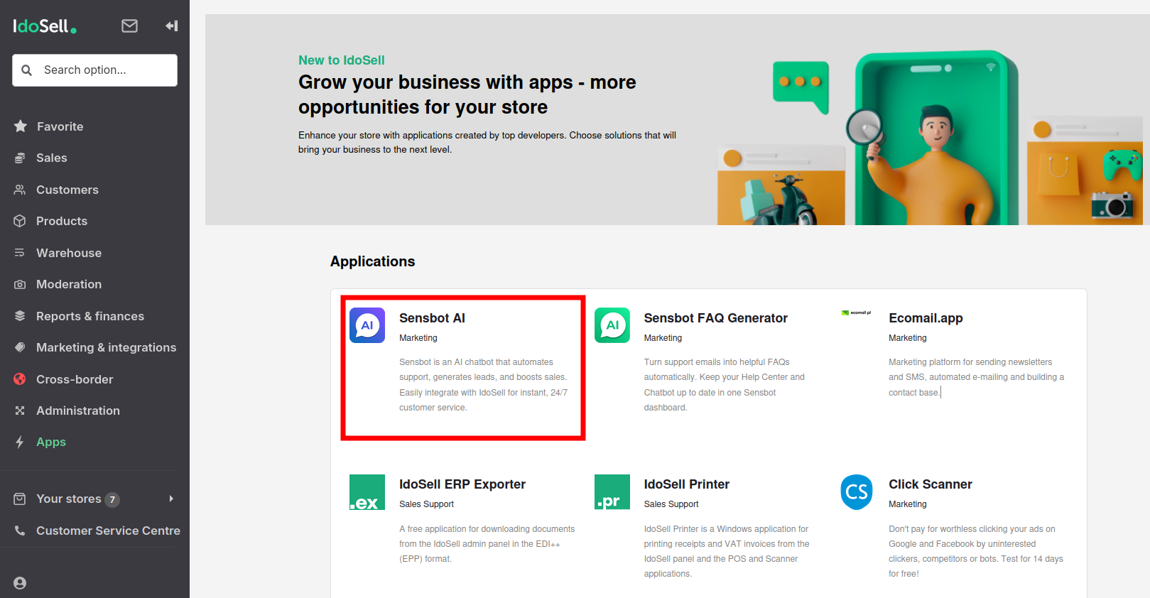 Easily power your IdoSell store with an intelligent AI chatbot using Sensbot. Follow these steps to install and configure it.✅ Step 1: Install Sensbot from the Apps Section