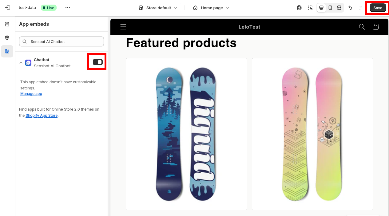 - Toggle the switch to Enable Sensbot AI App Embed.