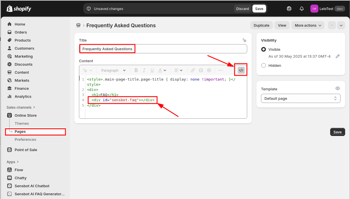 - Select or create the page where you want the FAQ to appear (e.g., “Frequently Asked Questions”).