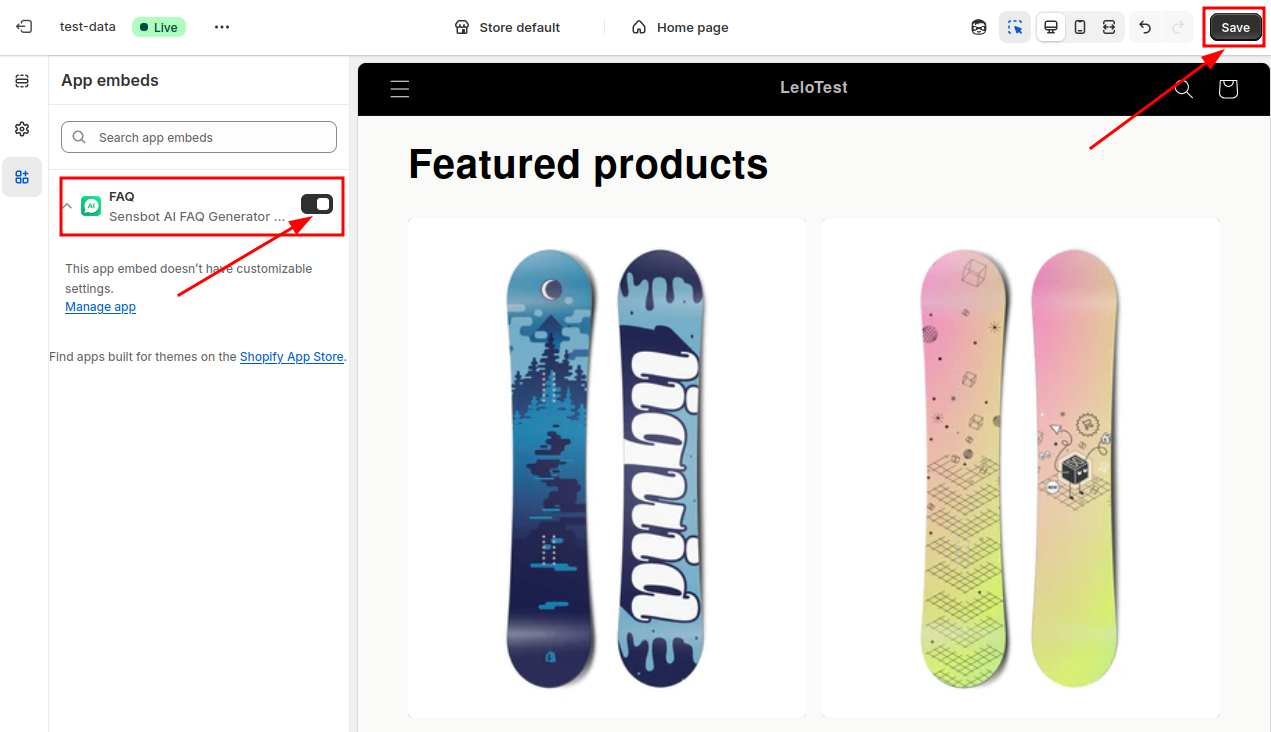- Find Sensbot AI FAQ Generator under App Embeds.