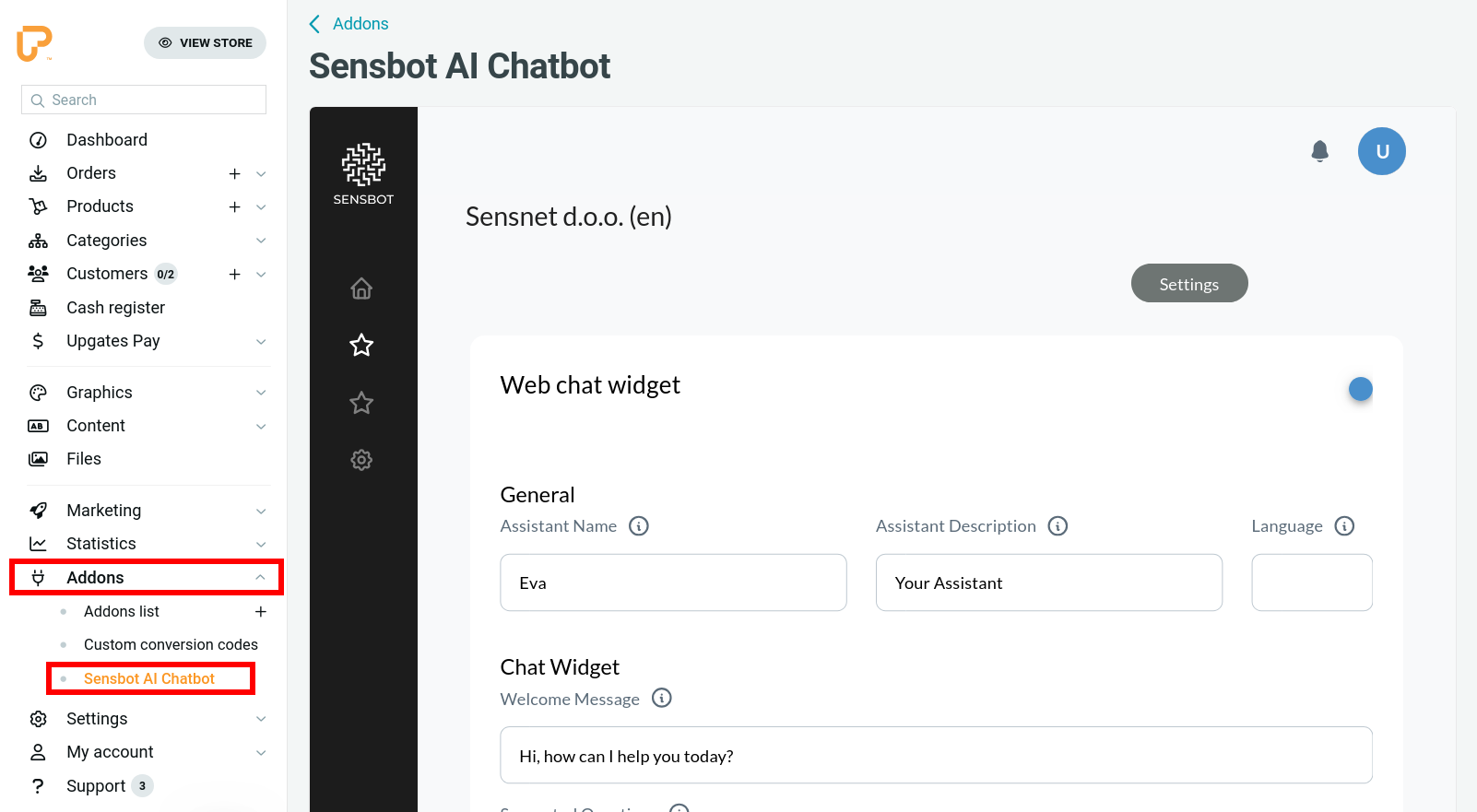 - After installation, go to Addons > Sensbot AI in your Upgates admin panel.